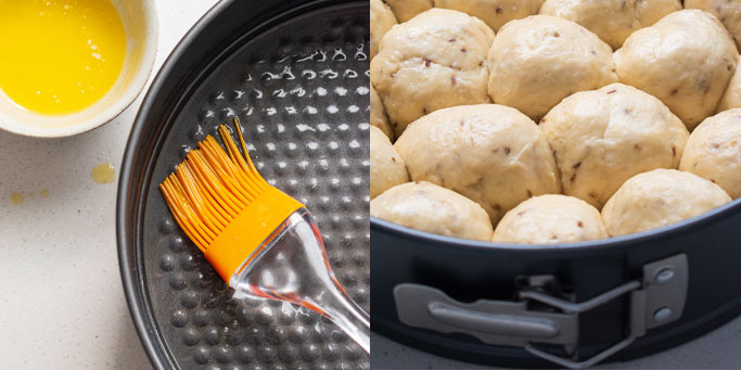 - Line a baking tray with melted butter. Remove the dough from the fridge and section the chilled dough into 20 balls weighing approx. 70g each. Tightly pack the balls into a lined baking tray.