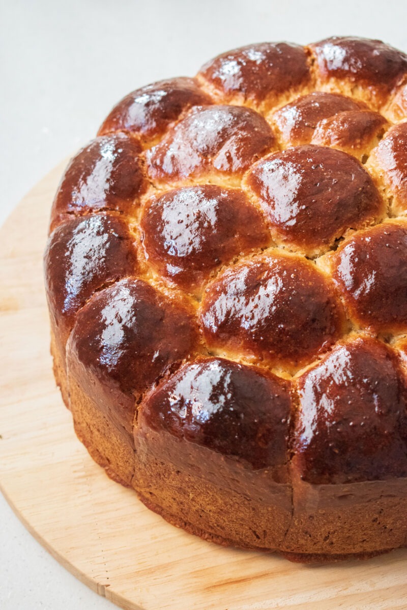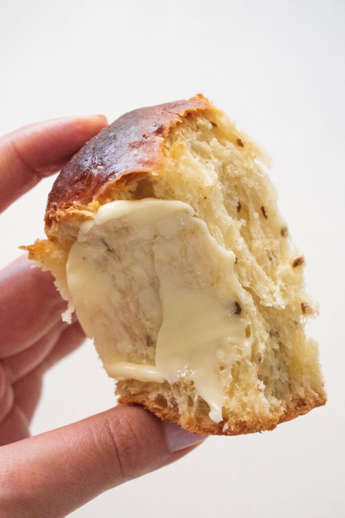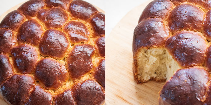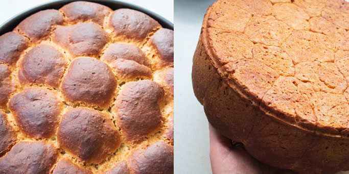 - Meanwhile, melt the sugar and water together. Remove from the oven and release from the baking tray. Brush the top with the glaze ensuring you've covered the surface generously. Serve immediately with butter OR gently start pulling them apart once they're cool enough to handle but still warm.