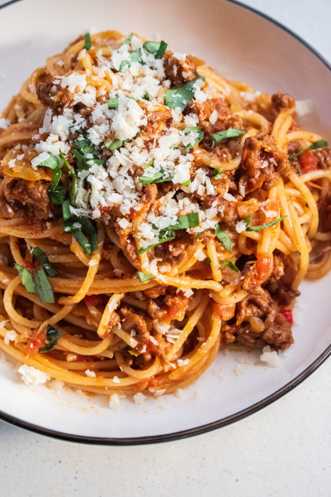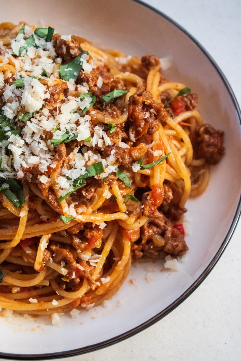 here’s something magical about Bolognese; it just seems to be most people’s go-to sauce, and I know it most certainly is mine. This recipe is perfect for when you get hit with that “big saucy bowl of pasta” mood and can easily be ready in around 30is minutes. The sweet scent of sautéed onions and carrots mingles with the robust earthiness of browned meat. The red wine vinegar’s subtle fragrance lifts the whole pot, while the tomatoes add a fresh acidity and bring all that sauce. It’s a smell that fills the kitchen, promising warmth, comfort, and satisfaction. It also encourages a cook to celebrate how a few ingredients can make for a deliciously tasty bolognese sauce.