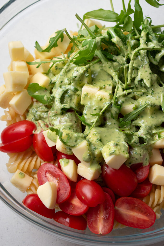 - In a mason jar or to a blender, add basil pesto, olive oil, white balsamic vinegar, fresh garlic, and salt together. Mix well then drizzle over the pasta. Toss to coat and taste for seasoning. Prior to serving, drizzle over the balsamic reduction.
