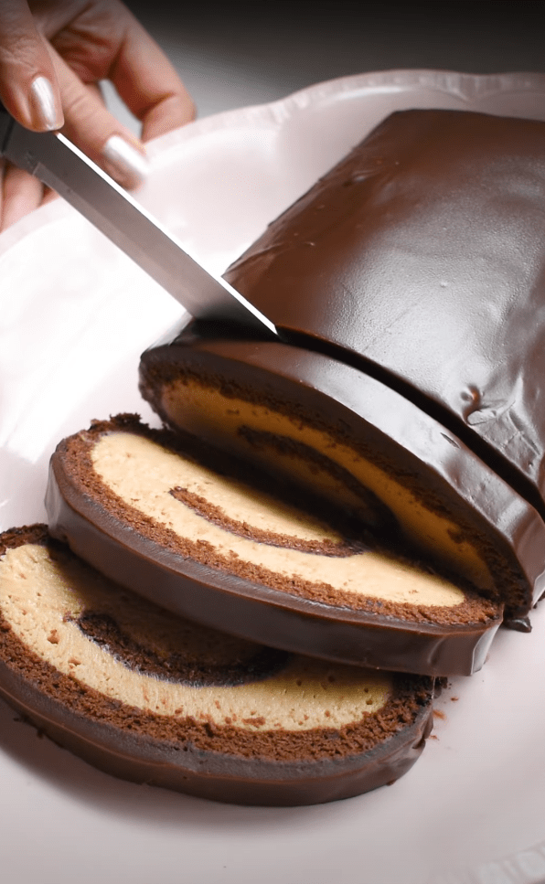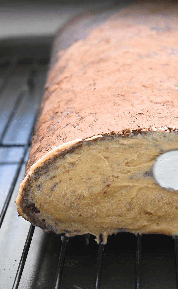- Slowly and gently unroll the cake. Spread peanut butter mousse filling evenly on top of the cake. Gently roll the cake back up, without the parchment/towel this time. Place on a wire rack set on a baking sheet (to catch the extra ganache). You can place the filled cake roll in the refrigerator while you prepare the ganache.