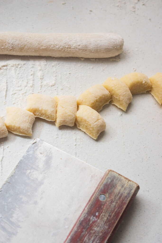 - Once rested, lightly dust the countertop with rice flour. Slice into 4 equal parts and roll each piece into a long strip. Using a bench scraper or knife cut the gnocchi into bite size chunks. Place onto a separate tray, add a generous dusting of rice flour to ensuring the gnocchi stays separated from one another. Note: the gnocchi might be a bit sticky so use the rice flour as you need. Also, the gnocchi will swell once boiled so keep the sizing in mind when you cut the gnocchi.