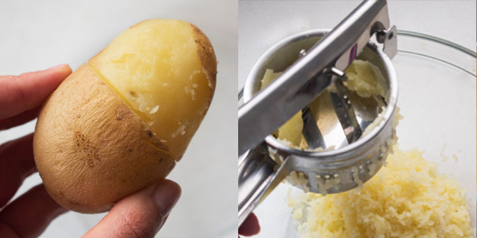 - Mash the potato using a potato masher and gently push the mashed potato through a sieve. This'll ensure a light and pillowy soft gnocchi.