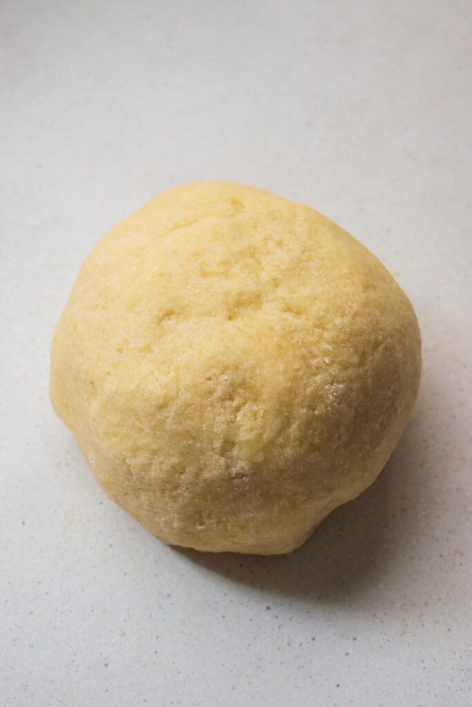 - In a medium bowl, add the mashed potato, egg yolk and salt. Roughly mix and add some of the flour. Gently combine using a fork, the texture will be crumbly. Continue adding the flour until mostly combined.