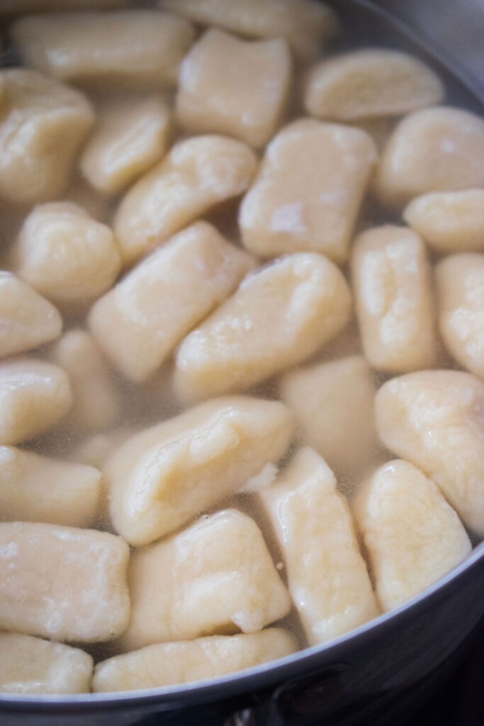- Add water to a medium saucepan and bring to a rolling boil, gently add the gnocchi to the water, giving it a gentle stir, and cook the gnocchi until the whole batch has floated to the top. Drain and add directly to the sauce.