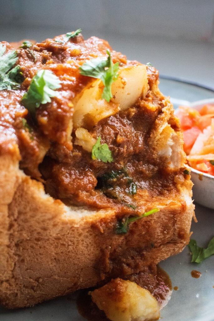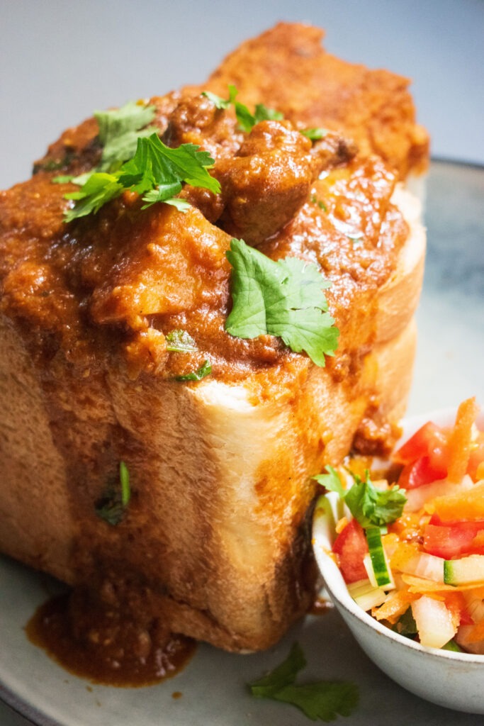 Once the Durban Lamb curry is ready, it’s time to assemble. I cut the bread loaf, hollow it out carefully, and ladle in generous portions of lamb curry. I like to top it with fresh coriander for a little herby brightness. Serve with extra curry on the side for dipping or pouring over.