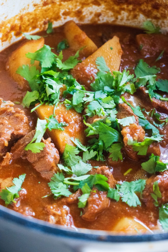 Regarding the protein, you can use lamb, mutton, chicken or go with a vegetable option. Activating the aromatics in the oil prior to browning the onions is a crucial step. This will absolutely level up any curry. After adding the spices and tomatoes, I pour in some stock and let it all simmer away until the lamb is fall-apart tender. The aroma alone will have your kitchen smelling like a spice market.