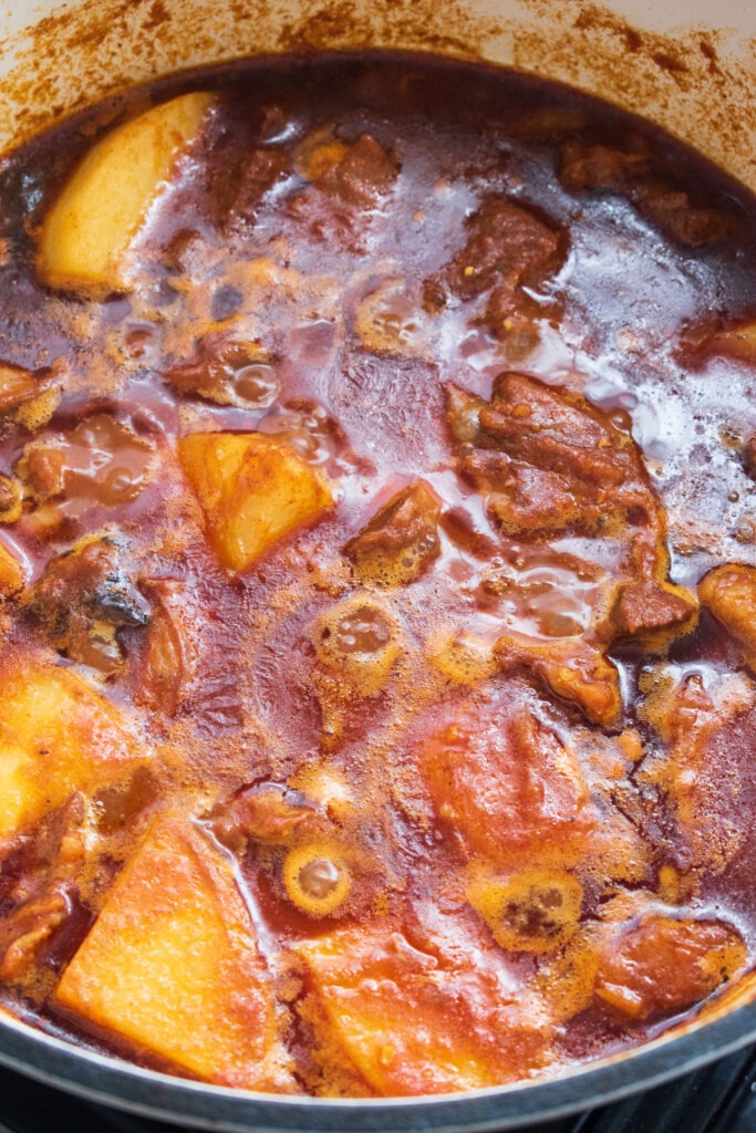 - Add potatoes and 2 1/2 cups warm water. Cook, uncovered, for 40-60 minutes or until the meat and potatoes are tender.