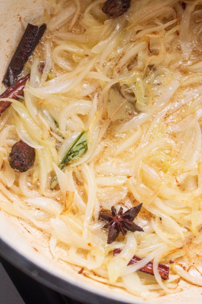 - Bring a large saucepan or Dutch oven to a medium-high heat. Add oil, chili, cinnamon, star anise, black cardamom, cloves, cumin seeds and a bay leaf. Sauté for 1 minute or until fragrant. Note: you could add the curry leaves now as this with intensify the flavour but this is optional.