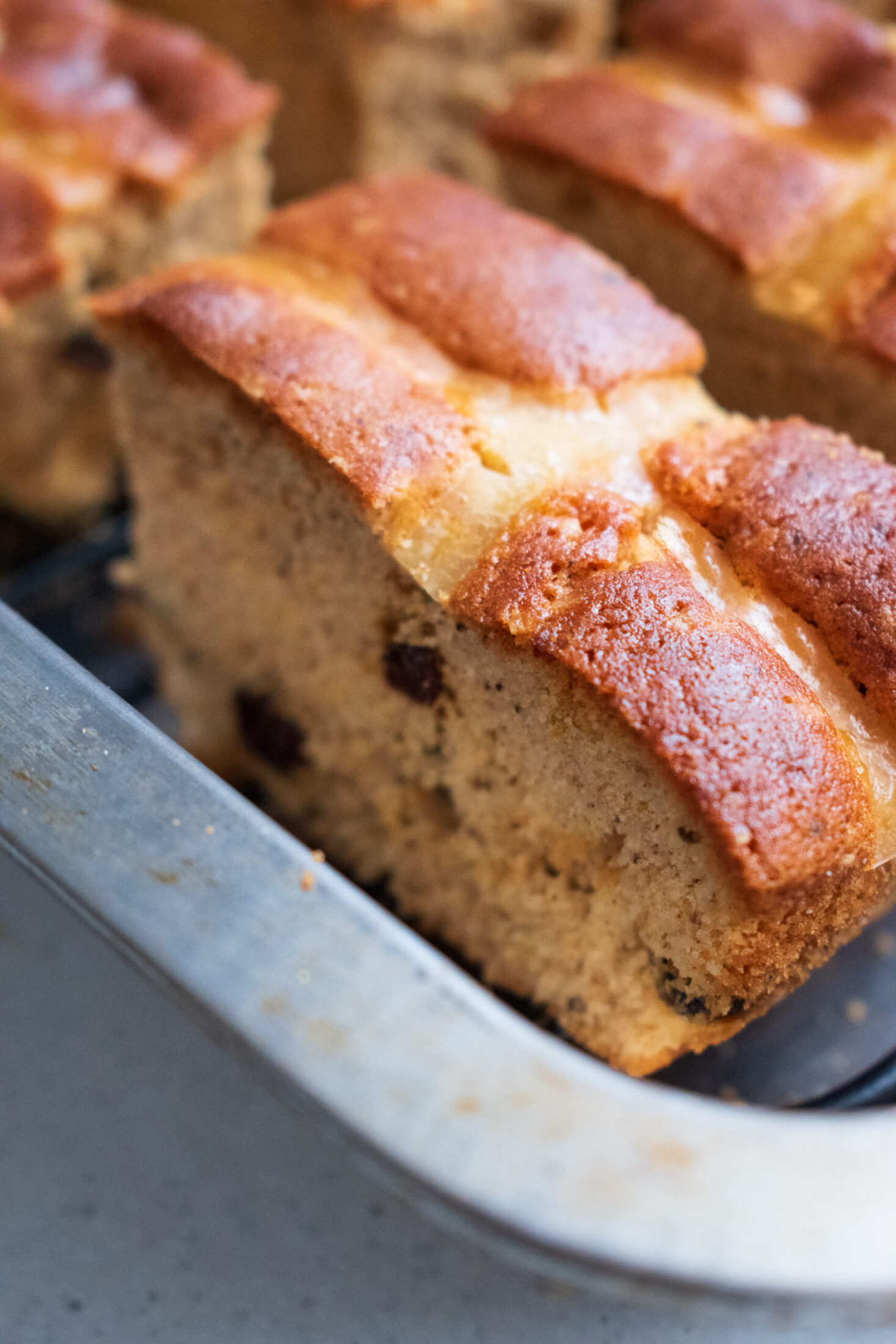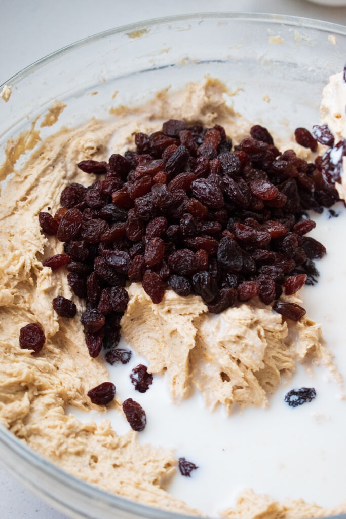 - Add the milk and sultanas or raisins and mix until combined. Pour the batter into your prepared baking tin and spread out evenly.