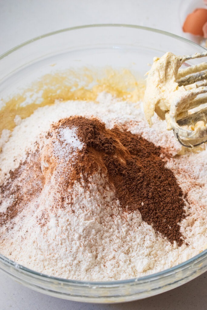 - Add in the orange zest and mix until well distributed, followed by the dry ingredient. Add the cake flour, baking powder, ground cinnamon, ground all spice and salt. Slowly mix until the dry ingredients until fully incorporated. Note: once the flour has been added, make sure not to overmix as this increases gluten development, but also ensure there aren't any flour pockets remaining.