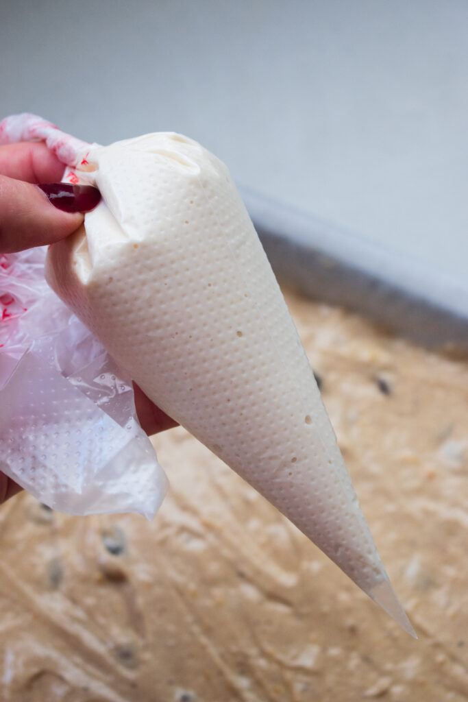 - Note prior to adding the Crosses: I personally like the look of each rusk having a little cross on top but this means you'll need to do a bit of planning. What I do is I evenly mark the baking tray's rim with any leftover batter. This helps indicate where I'll be slicing the sponge, so in between those marks, I pipe the crosses. This step isn't necessary but it does look very pretty. You'll aim to slice 4 sections from the length side of the tray and 8 sections from the width side, yielding 32 rusks in total. Note: I wouldn't cut them thicker than 4-5cm, otherwise they'll take forever to dry out. Also take note of the fact that the sponge will shrink while drying so take that into consideration. Please refer to the images in the recipe blog post for reference.