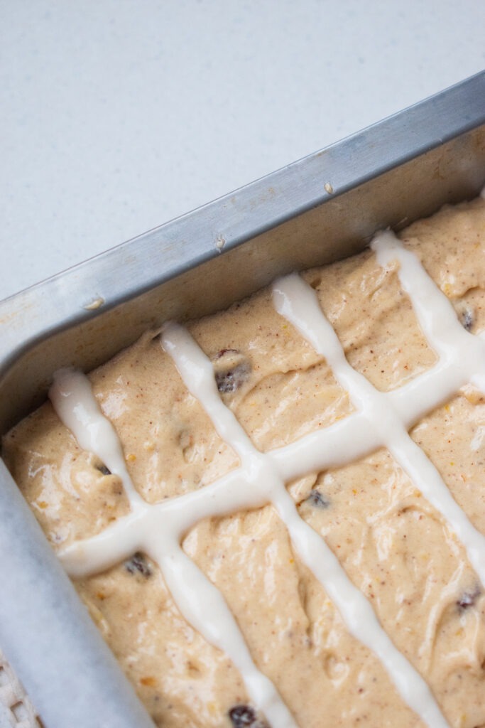 - In a small bowl, mix the flour and water together, it needs to be quite thick so resist diluting it with more water. Transfer the flour mixture to a medium piping bag or even a Ziplock bag, twist or seal the bag and cut the tip. You're aiming for a 1cm radius. Add the crosses on top of the raw batter.