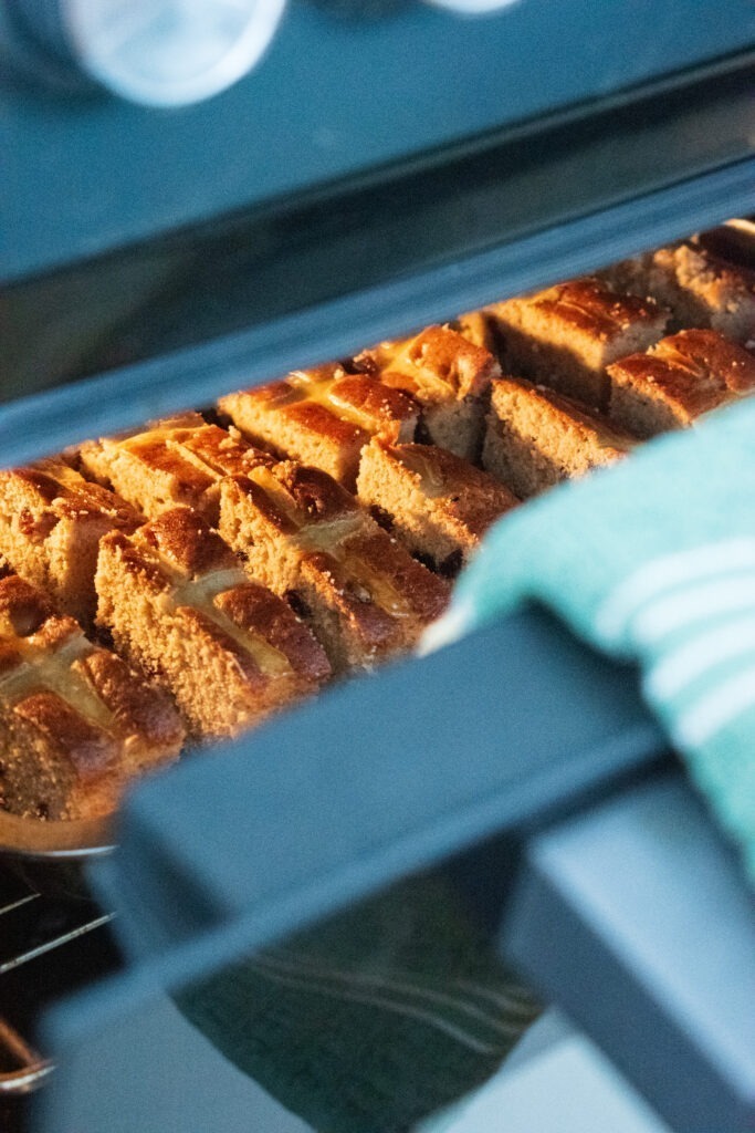 Cinnamon and allspice for that hot cross bun warmth, but feel free to add nutmeg or mixed spice just go to heavy on spices – want those warm notes to lace itself throughout the sponge and not overpower it