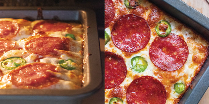 This method gives the pan pizza a crispy bottom and chewy center—the best of both worlds. The tomato sauce brings that familiar tang, the mozzarella melts into stretchy perfection, and the salami crisps at the edges, releasing its spicy oils into the cheese below. Slices of jalapeño add heat and crunch, waking up every bite.
