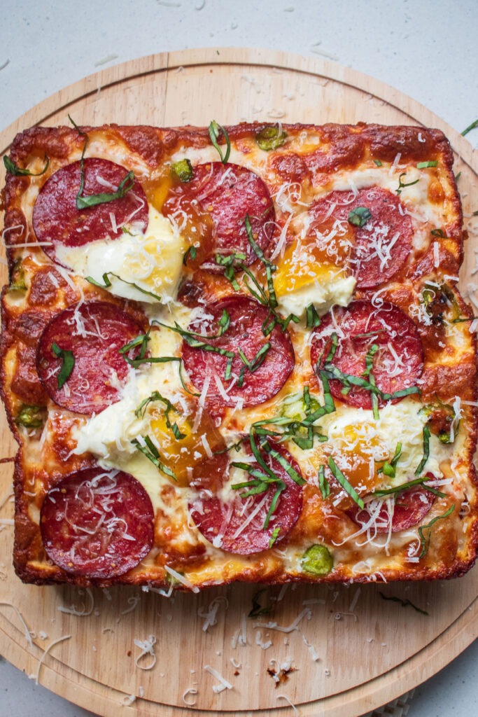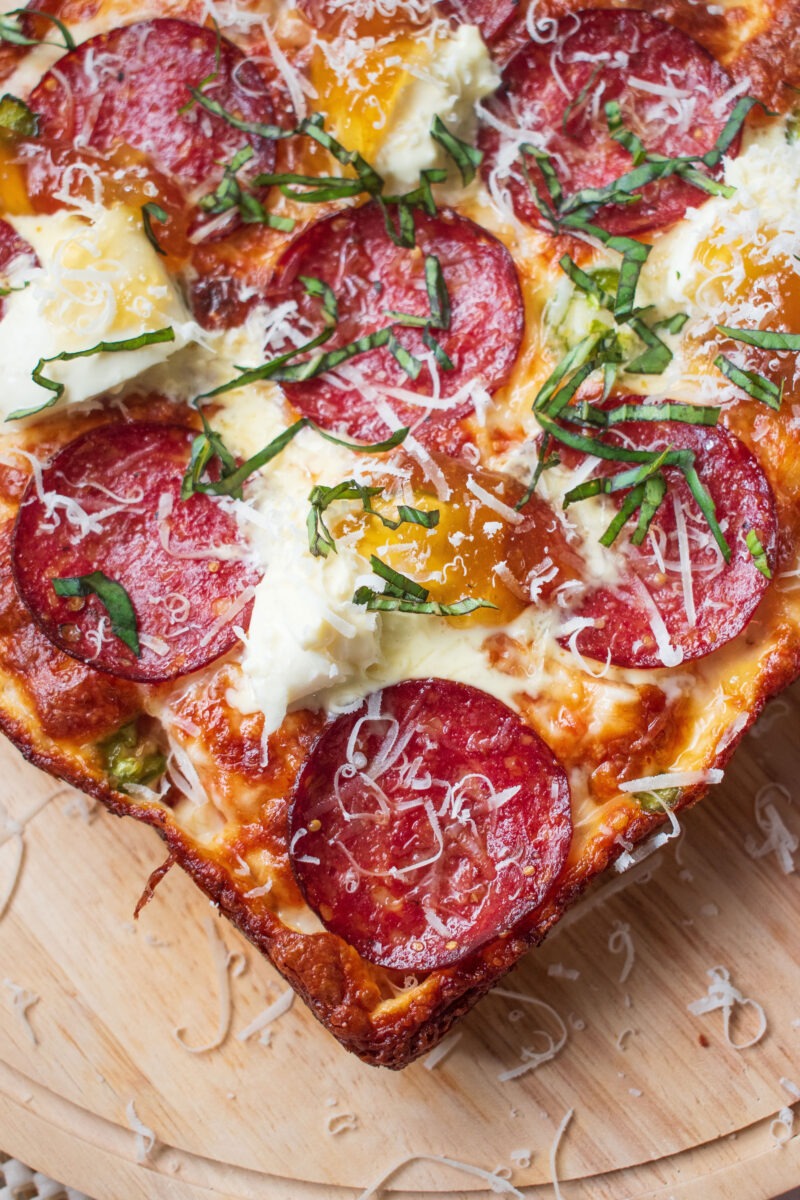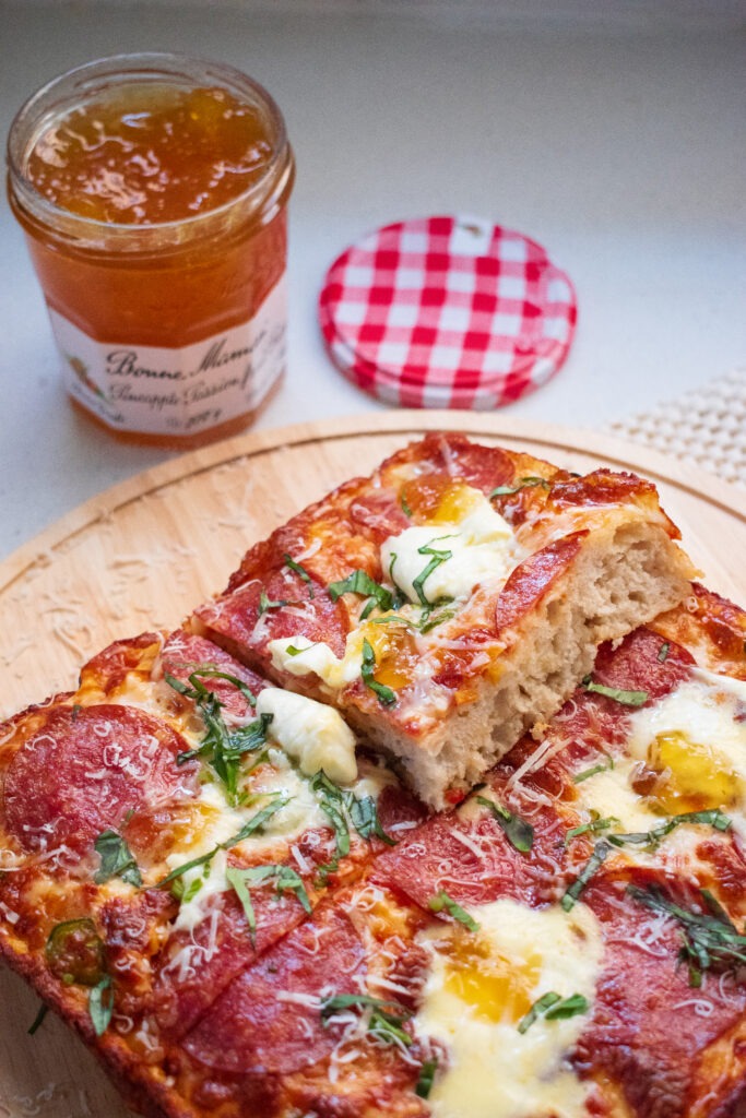 Pan Pizza - Loaded with Salami, Burrata, Jalapeño and a sweet fruit preserve!