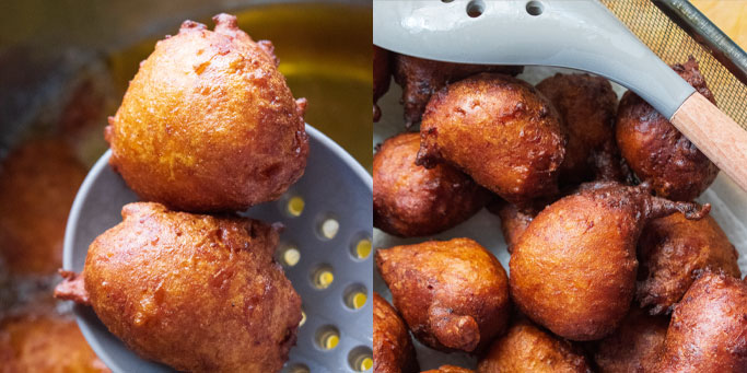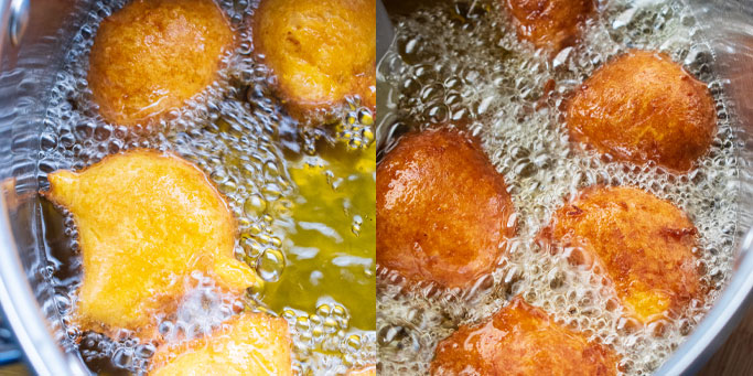 - Drop spoonfuls of the batter in the hot oil and fry for 2-3mins or until golden brown in color. Note: drop a tsp worth of batter in the oil to check the temperature, It should take about 8-10 seconds before it starts to brown.