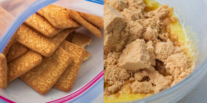 - Add the biscuits to a blender and blend until fine or place the biscuits in a ziplock bag and using a rolling pin, crush the biscuit until very fine. Add the butter to a medium sized bowl and place in the microwave. Heat until the butter has fully melted. Add the crushed biscuits and mix until fully combined.