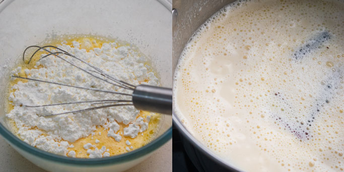 - Once the milk mixture is simmering, lower the heat and pour the egg mixture into the warm milk mixture whilst whisking. Continue whisking until the mixture thickens, about 2-4 minutes. Once the whisk start creating a pattern when whisking, you know it's ready. Note: Do not make the mixture too thick otherwise it'll struggle to adhere to the biscuit base.