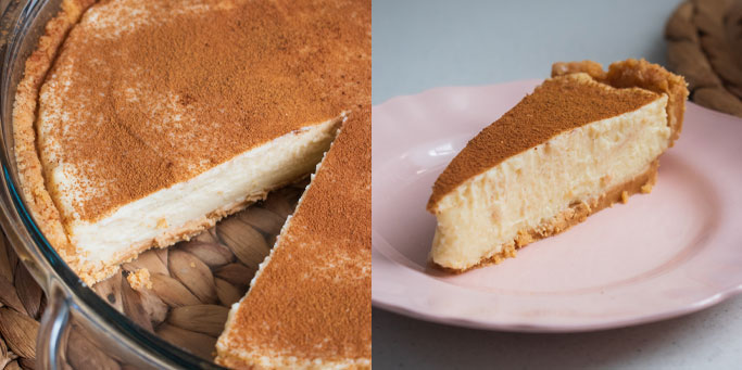 - Remove the base from the fridge and pour the custard in the base. Smooth the surface and finish off the cinnamon. Once the no bake milk tart has reached room temperature, you can cover the tart with cling wrap and place in the fridge to set for 4 hours or overnight.