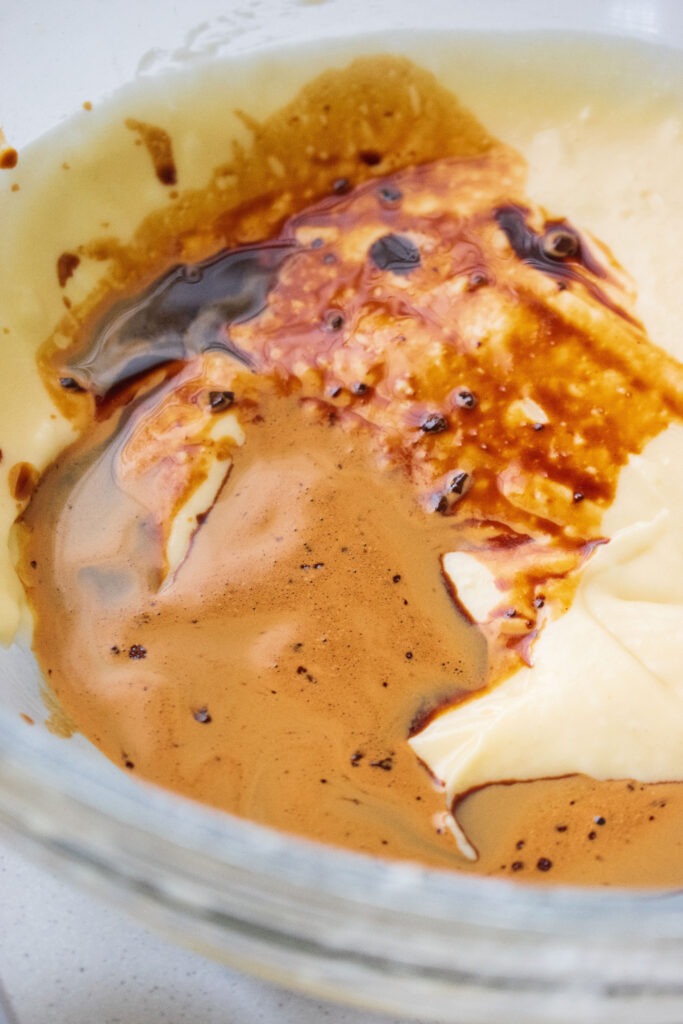 - Mix coffee and 1 tbsp warm water together and allow to cool slightly. Add to the remaining batter and combine. Add dollops of the coffee infused batter on top of the vanilla batter.
