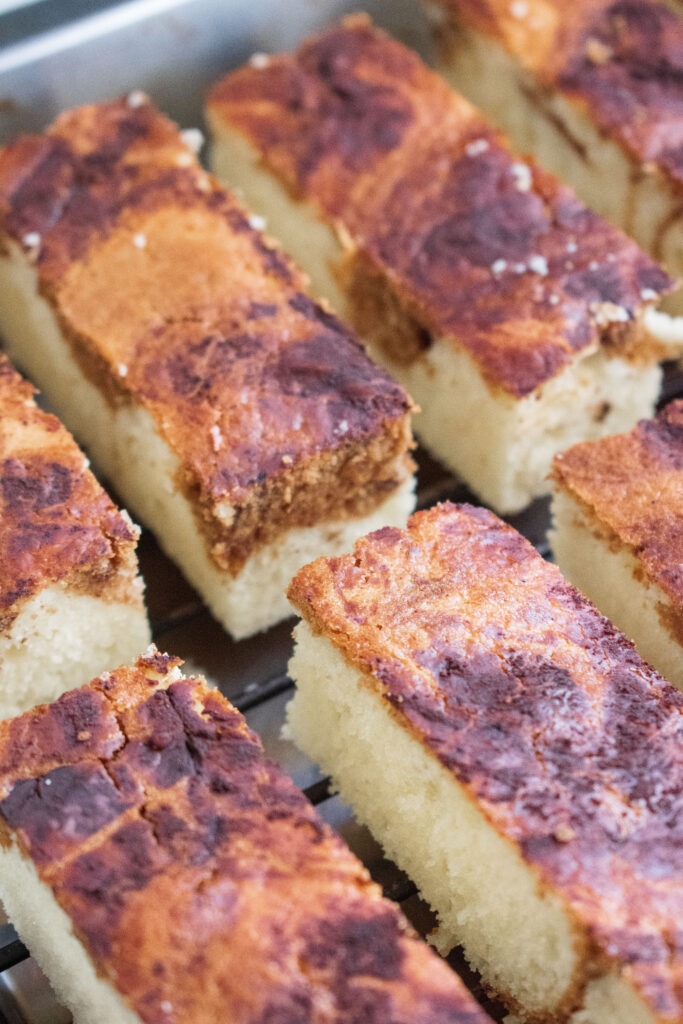 - Allow to cool slightly before slicing into rectangles and removing the sponge from the tray. Once the sponge has mostly cooled, you can start sectioning the sponge into rectangles using a serrated knife. Note: Aim for 4 rusks lengthwise and 8 rusks width wise (this is a personal preference but you can slice them thicker or thinner - it's up to you). The thicker they are the longer they will take to dry.