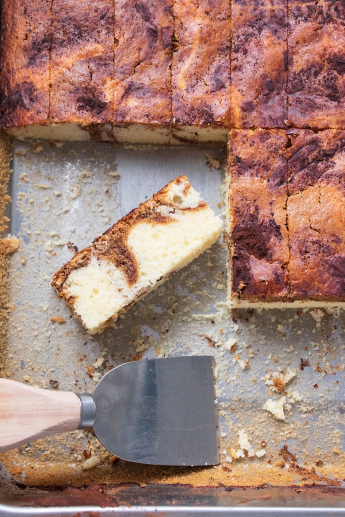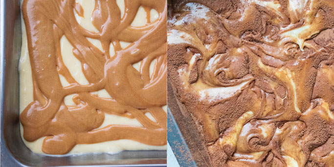 - Using a sift, dust a generous amount of cocoa powder on top. Using a butter knife or thin spatula, swirl the batters creating a marbled effect. The key is to create big swirls and not over mixing.