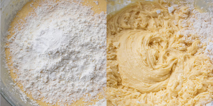 - Add flour, corn flour, baking powder and salt. Whisk until roughly combined and add milk. Continue mixing until fully combined but resist over mixing.