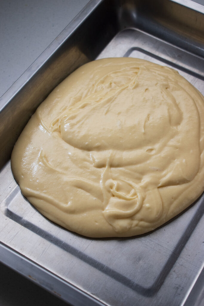 - Pour 2/3rds of the batter into the lined baking tin and gently spread evenly, ensuring the edges aren't spread too thinly.
